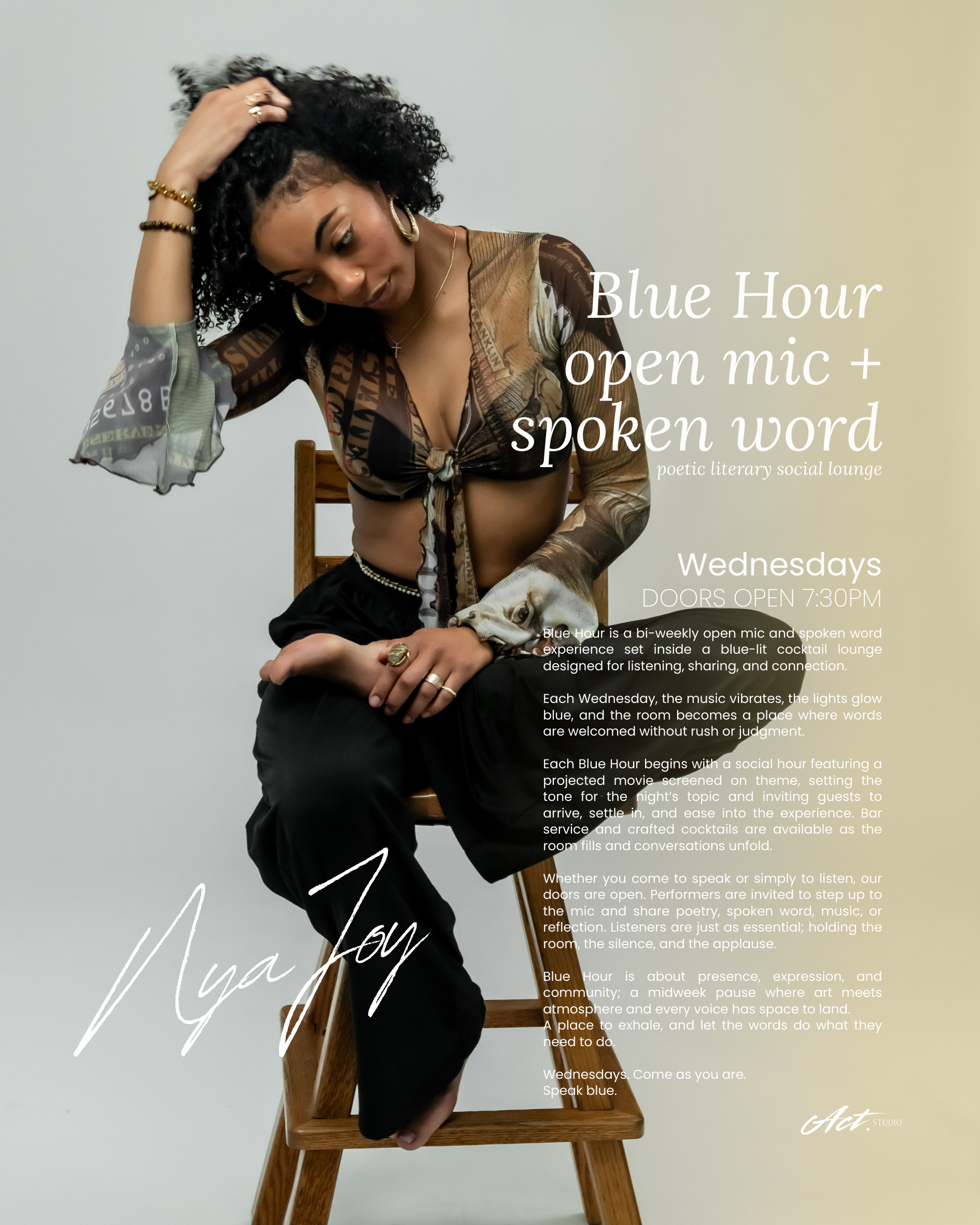 Blue Hour is a weekly open mic and spoken word experience held in a blue-lit cocktail lounge atmosphere. Each evening begins with a social hour featuring a projected movie aligned with the night’s theme, followed by live performances and open mic sharing. Whether you come to speak or simply to listen, this is a space for expression, presence, and connection. Bar service is available throughout the night.